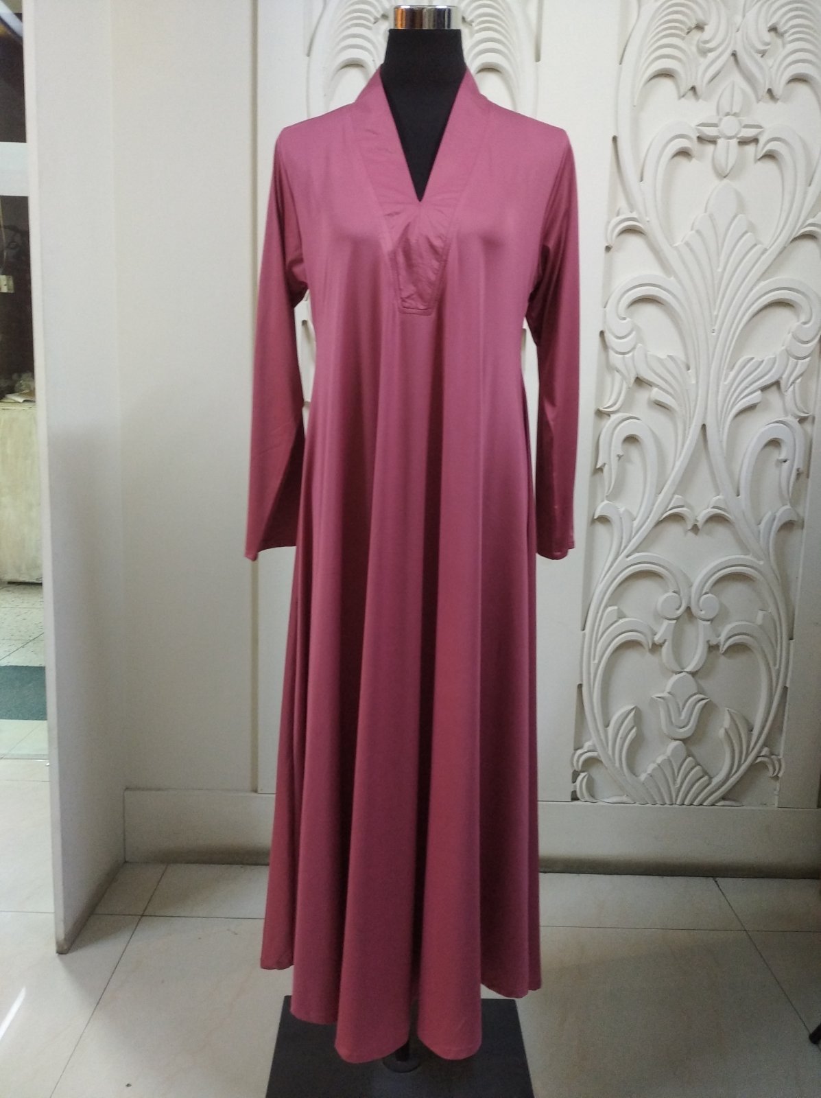 Long, flowing gown with a minimalist and modest design. It has: