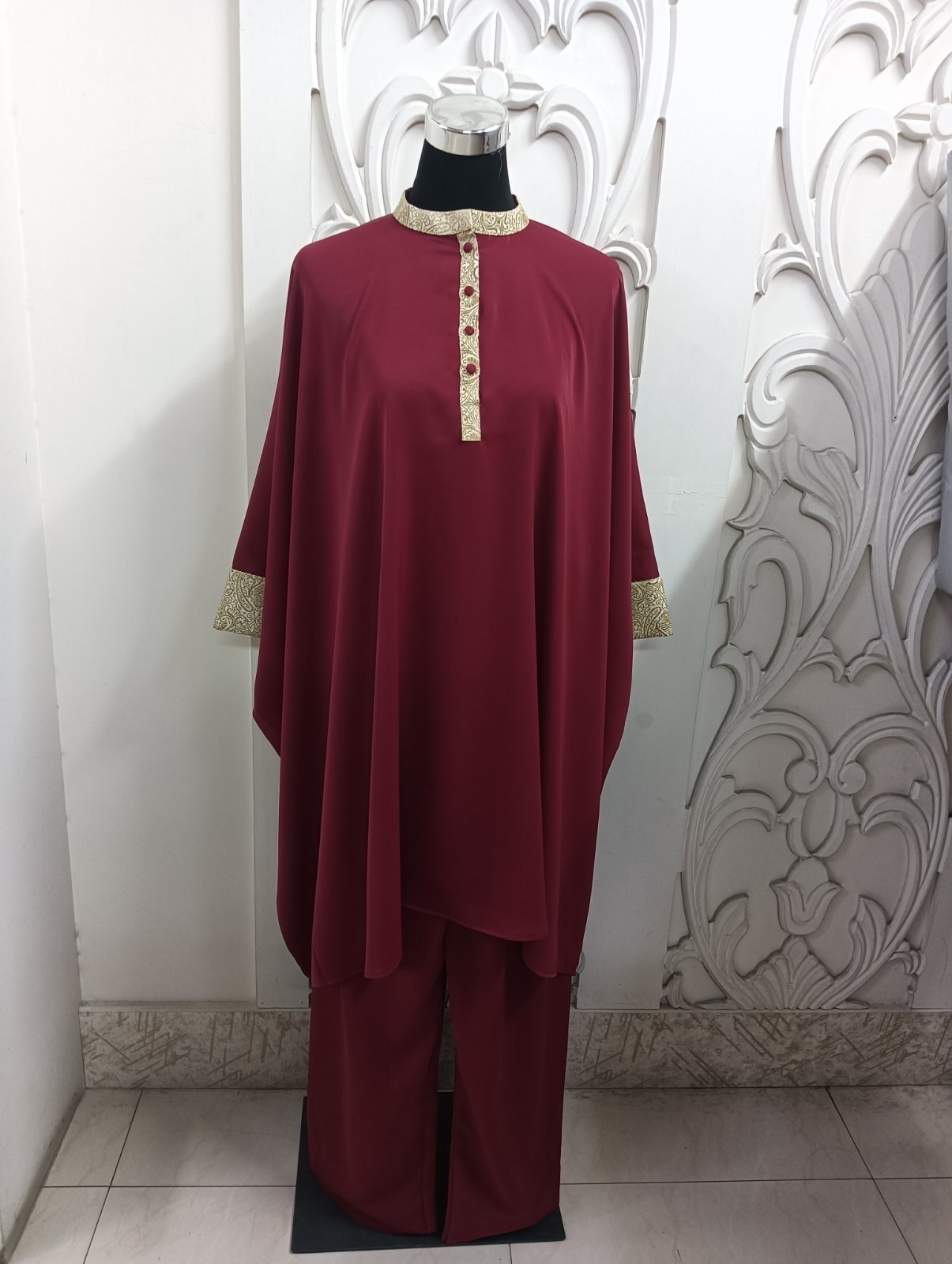 This outfit is a modest two-piece set . The top is loose-fitting giving it a flowy and comfortable look. It features a stand collar and button placket, both highlighted with katan border adorned with a subtle pattern, adding contrast and elegance. The same detailing is repeated on the sleeve cuffs for balance.