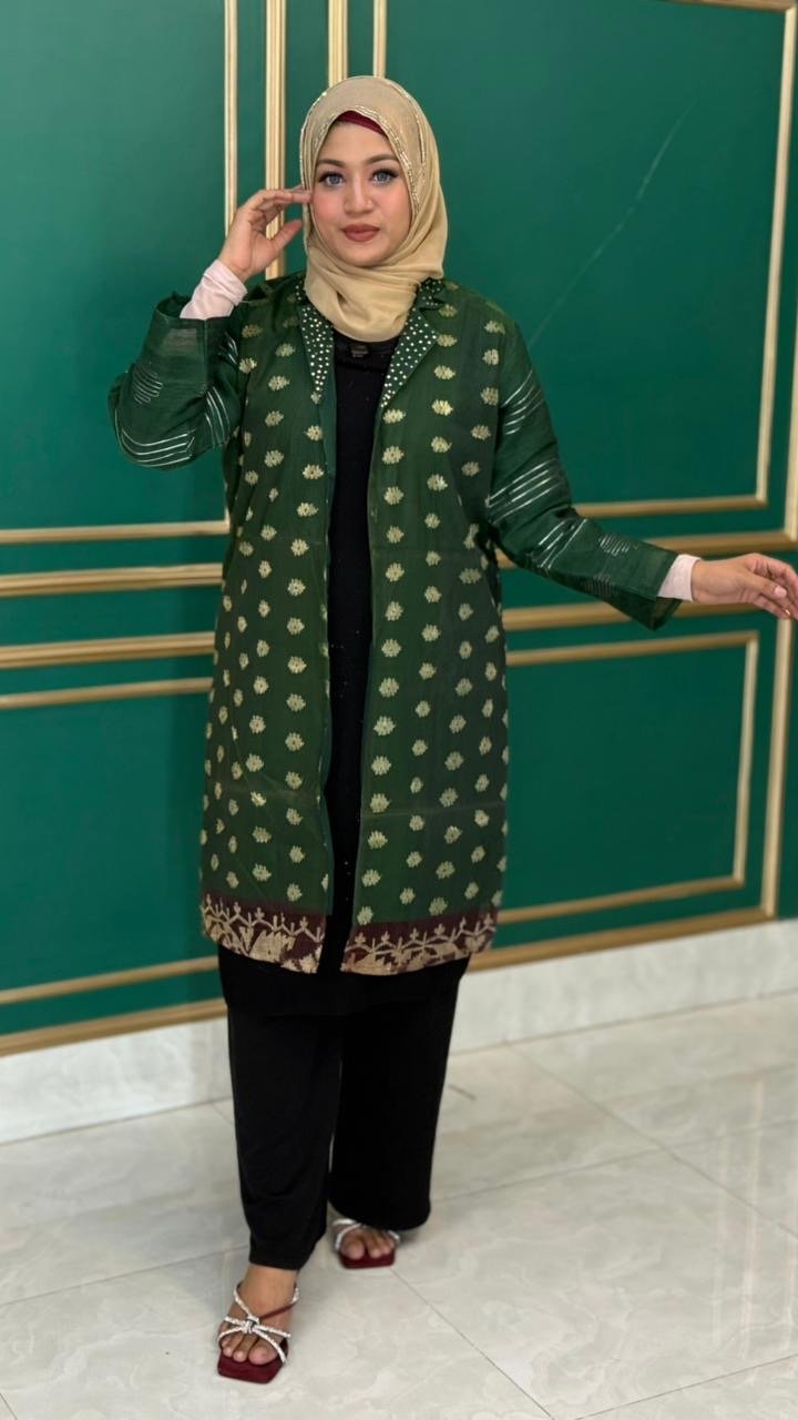 Introducing our Jamdani koti in original dhakaiya jamdani fabric. This koti features coat style neck design adding a touch of luxury to any outfit. Versatile for all-year-round wear, it’s the perfect addition to your wardrobe.
