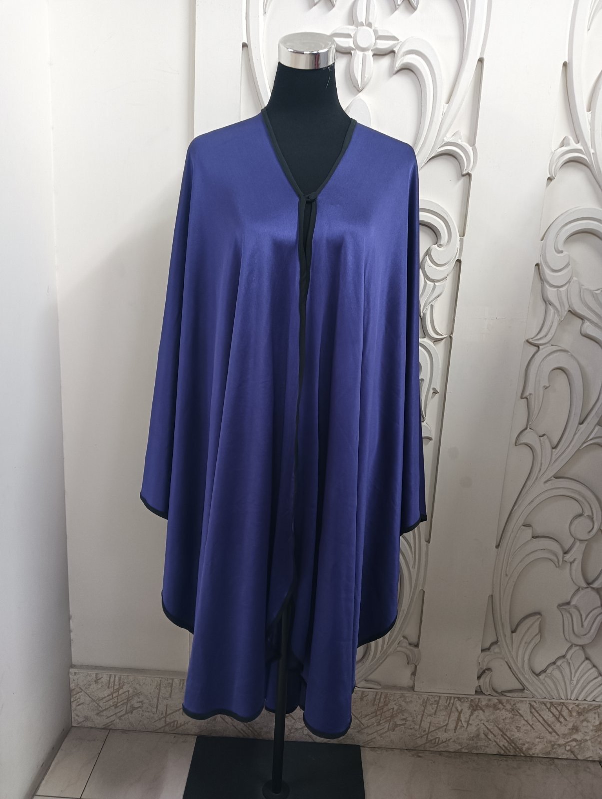 This is a loose, flowy abaya. The edges and neckline are trimmed with border, giving it a clean contrast. The neckline is a V-shape with a single button fastening at the center front. The hemline is asymmetrical, longer at the sides, and it has an airy, elegant appearance. This piece could be worn as a modest outer layer, a kaftan-style dress, or a stylish cover-up.