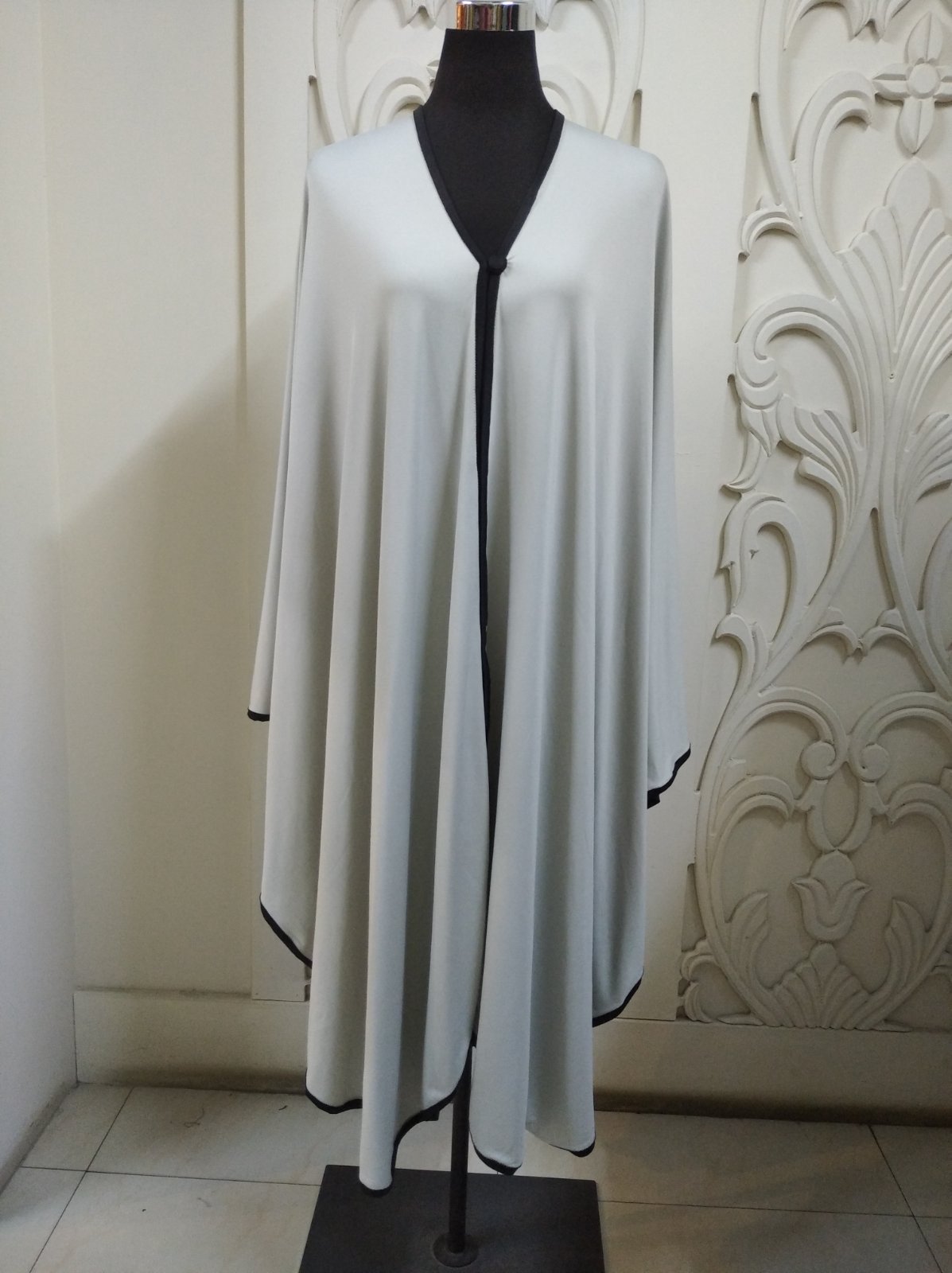 This is a loose, flowy abaya. The edges and neckline are trimmed with border, giving it a clean contrast. The neckline is a V-shape with a single button fastening at the center front. The hemline is asymmetrical, longer at the sides, and it has an airy, elegant appearance. This piece could be worn as a modest outer layer, a kaftan-style dress, or a stylish cover-up.