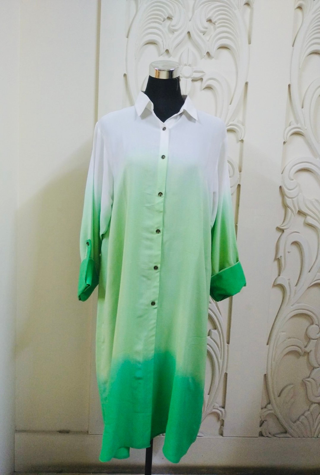 This is a long button-down shirt dress with an ombré gradient design. The top portion near the collar is white, blending smoothly into a light shade across the chest and torso, and then deepening into a vibrant hue toward the hemline.