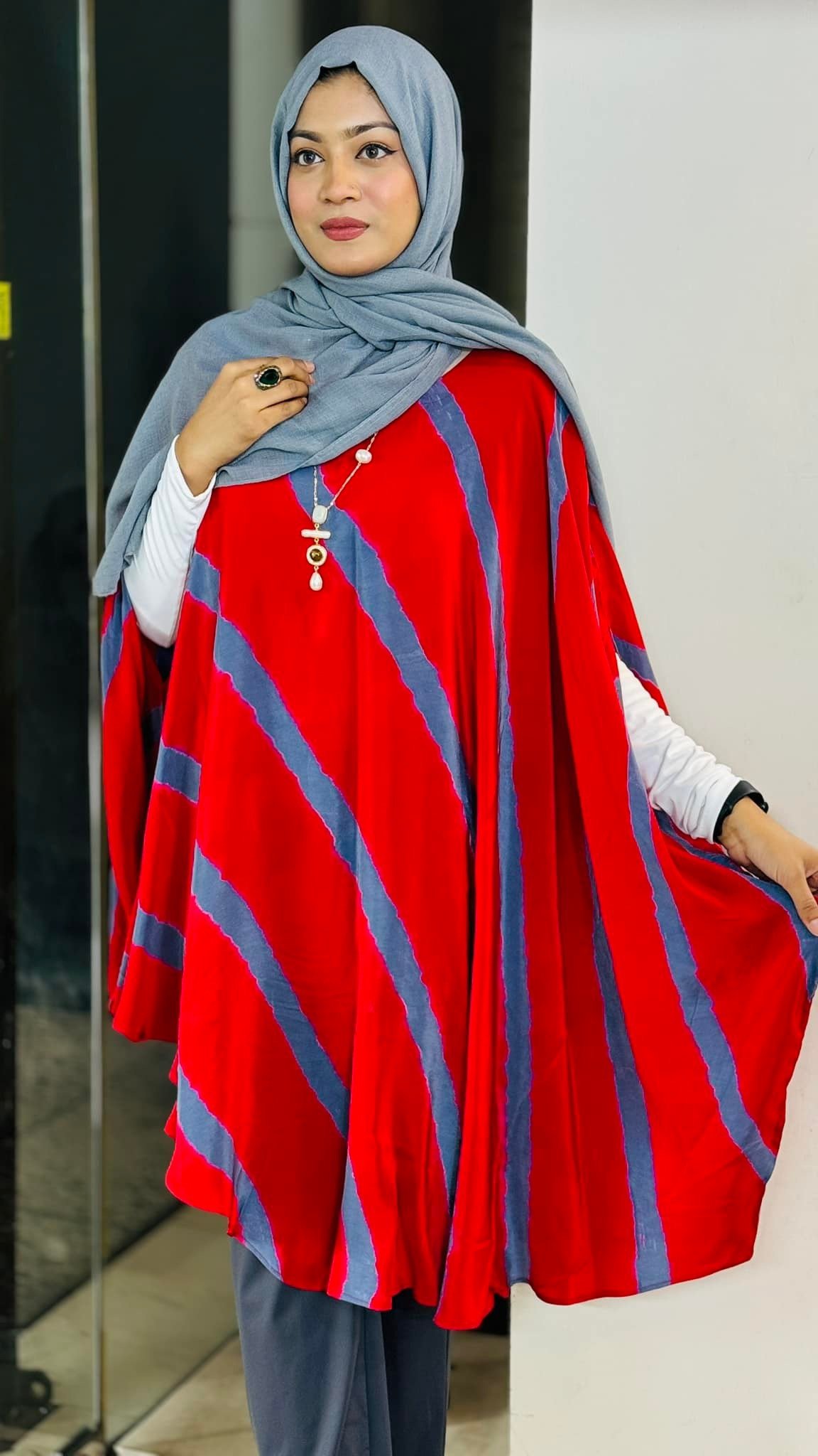 This is a vibrant, flowy top featuring a bold tie-dye pattern . The top has a loose, poncho-style cut that drapes gracefully, giving it an airy and comfortable look.