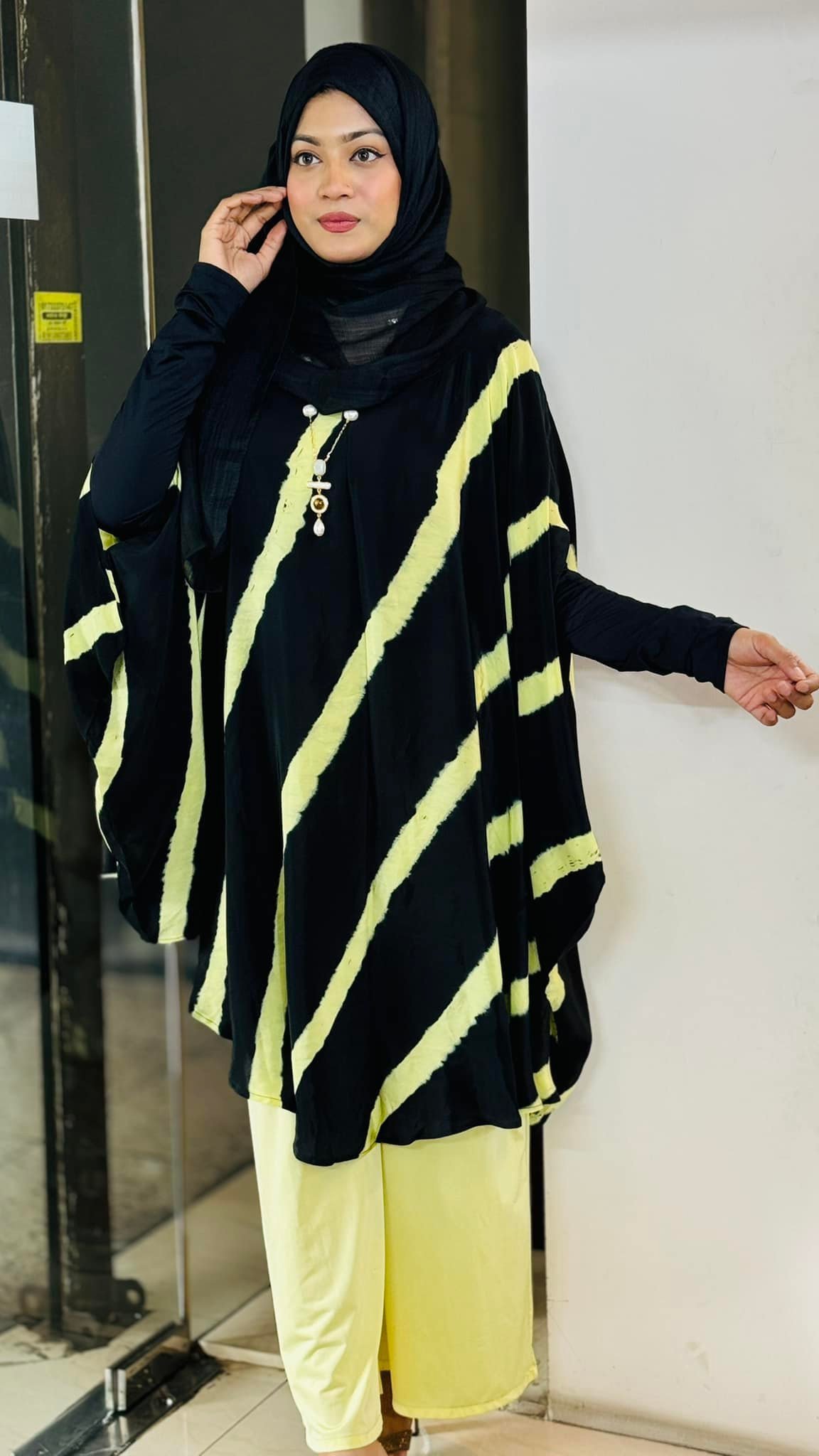 This is a vibrant, flowy top featuring a bold tie-dye pattern . The top has a loose, poncho-style cut that drapes gracefully, giving it an airy and comfortable look.